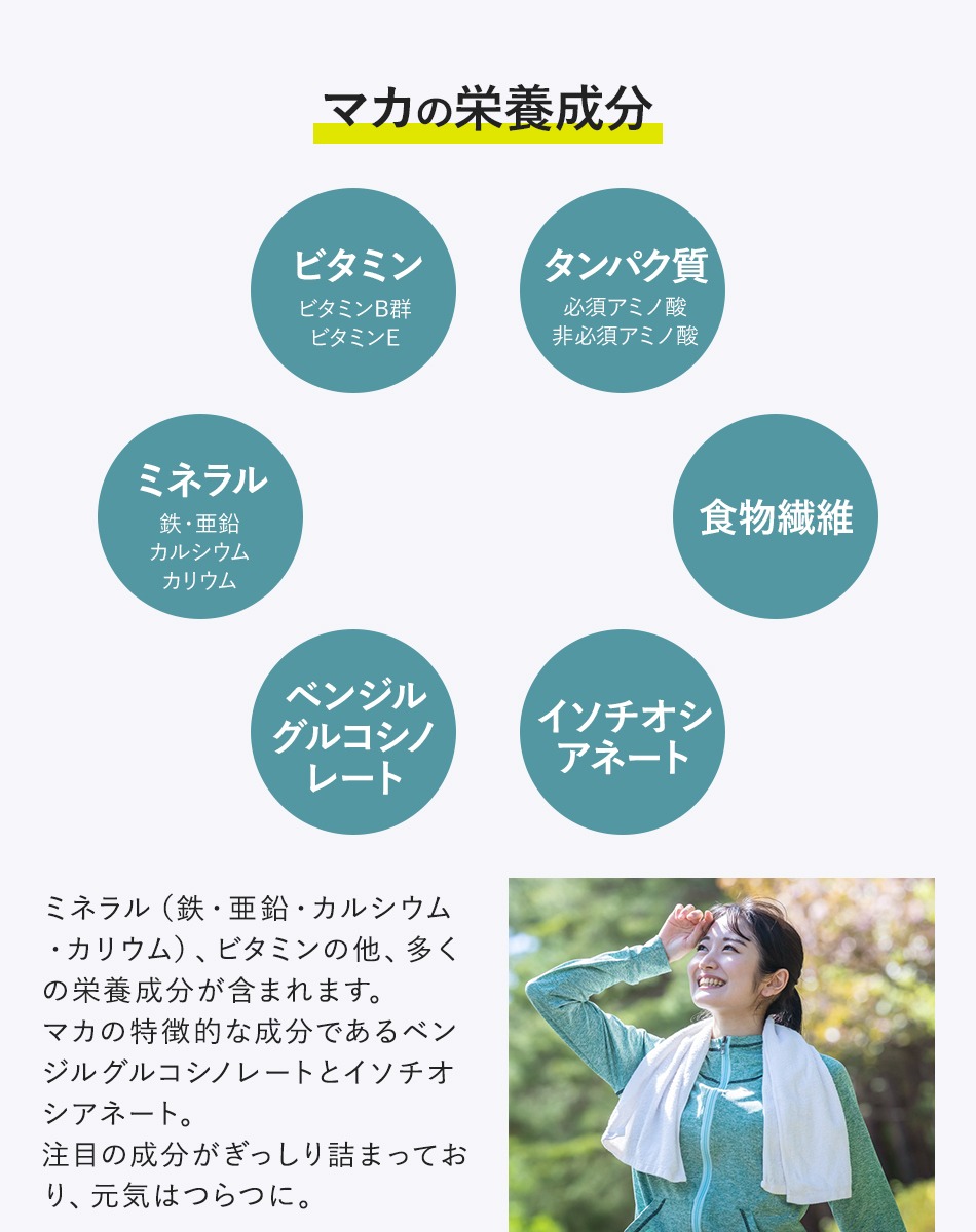 滋養強壮剤のイメージが強いマカですが、高たんぱくかつアミノ酸バランスのよいことは特におすすめポイントです。