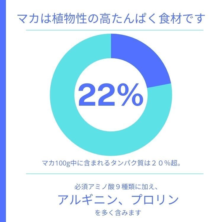 純マカは、高タンパク質の植物であり、特にアミノ酸(アルギニン、プロリンなど)、ミネラル、ビタミン、食物繊維が豊富です。これらが身体の活力を引き出し、心身ともに充実した毎日をサポートします。